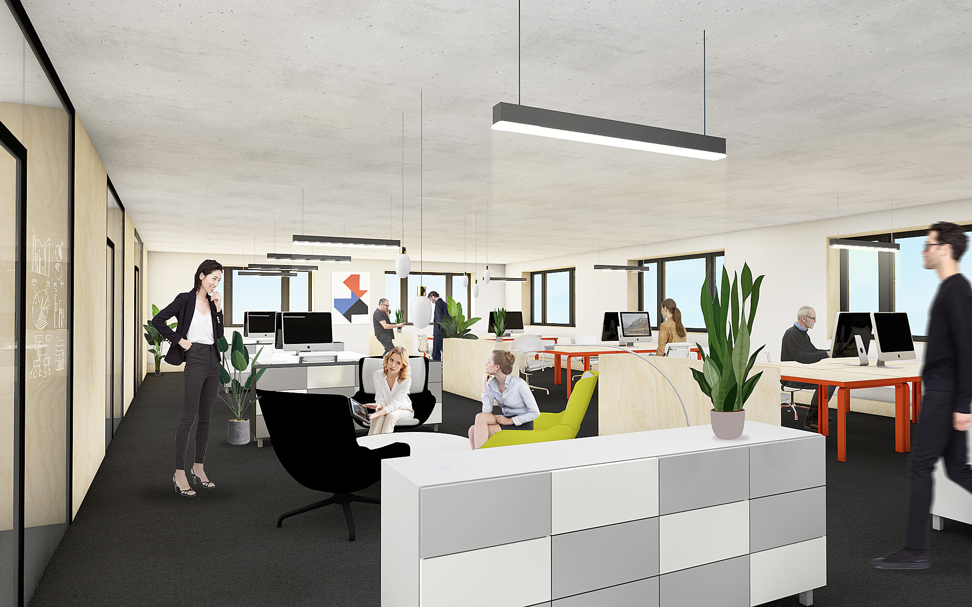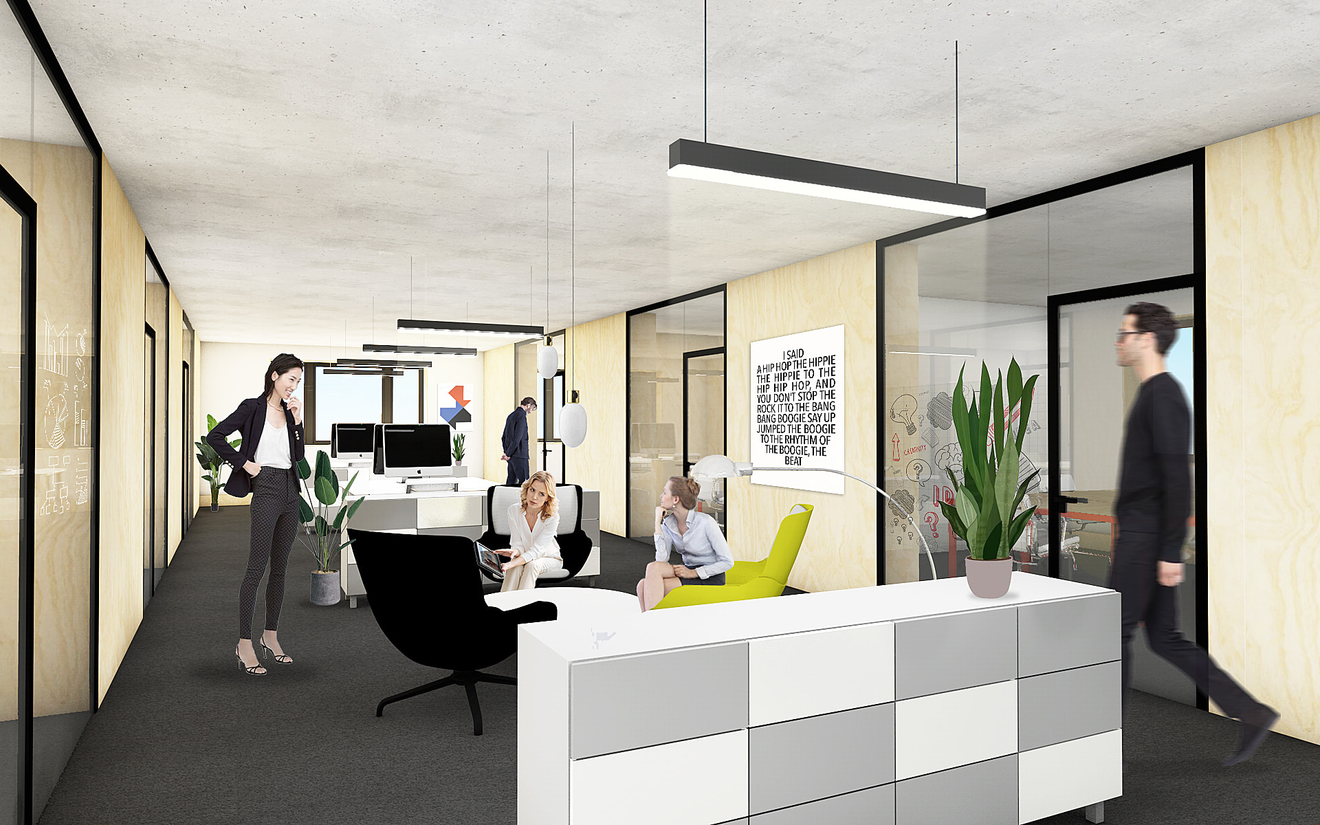 Alle Büroeinheiten auf den vier Etagen sind individuell planbar. Es gibt keine tragenden Innenwände, so dass die Büroeinheiten sehr individuell angeordnet werden können.