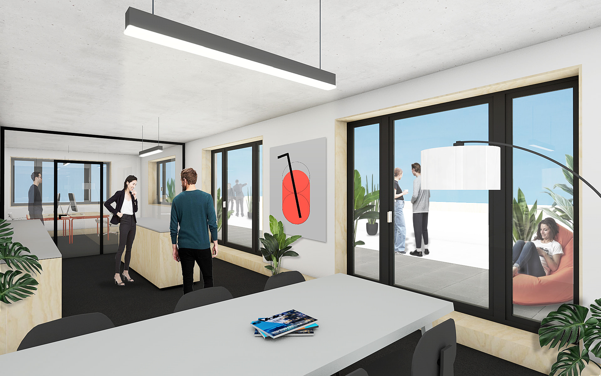 Mit Ausnahme des Erdgeschosses verfügt jede Etage über eine große Terrasse. Die Plaza des Gonsberg Campus und die gegenüberliegende Eventhalle mit großer Freiterrasse und Gastronomie, lassen Arbeitsalltag und Freizeit miteinander verschmelzen.